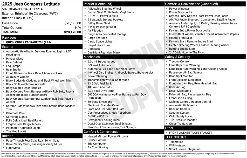 Many Jeep safety systems are standard, including automatic braking, active lane management, blind-spot monitoring, hill start assist, a rearview camera, forward collision warning, a driver attention monitor, rear cross-traffic alert, tire pressure monitoring, and more. Our Compass Latitude is a compact SUV leader with features like those! Save this Page and Call for Availability. We Know You Will Enjoy Your Test Drive Towards Ownership! Price includes: Processing Fee, $1500 - 2025 National Retail Bonus Cash . Exp. 12/01/2025 $2000 - 2025 National Holiday Select Inventory Bonus Cash. Exp. 12/01/2025 Price includes $1,000 Trade-in Bonus Cash. Must trade in a 2010 or newer vehicle. Some restrictions apply. See dealer for details.