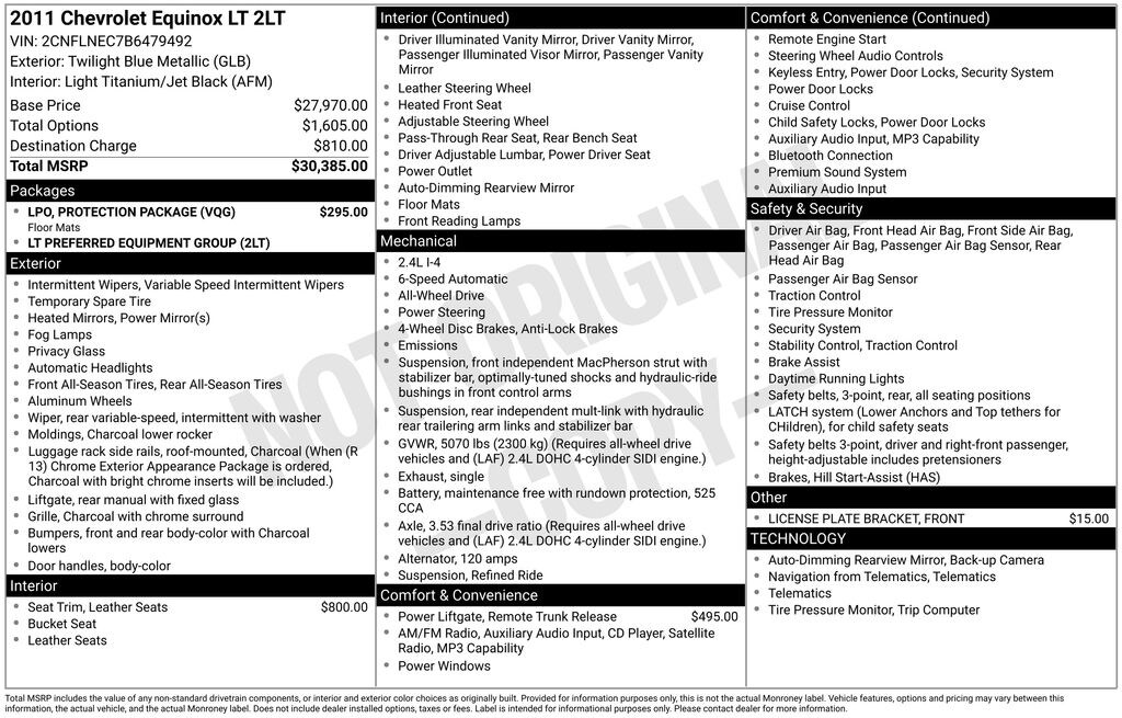 Look no further than our 2011 Chevrolet Equinox LT AWD proudly displayed in Supersonic Blue Metallic! Powered by a 2.4 Liter V6 offering 182hp that is perfectly paired to a 6 Speed Automatic transmission for easy passing. Our All Wheel Drive SUV combination secures up to 24mpg on the highway and will turn heads with tinted rear windows, roof rails, and great-looking alloy wheels.