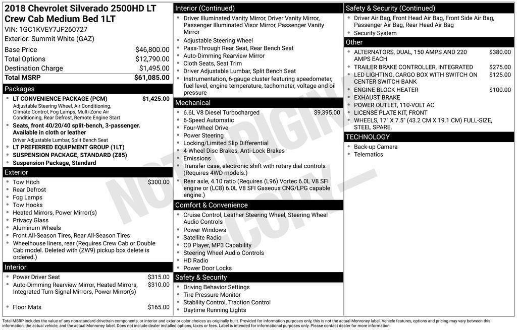 Why BUY from Gregg Young Chevy Omaha? When you choose this Summit White 2018 Chevrolet Silverado 2500HD LT with 86,899 miles, you are not just buying a used vehicle - you are investing in quality, reliability and peace of mind. Our clientele depend on us for Transparent Pricing, Convenience and, most importantly, Customer FIRST Service! All purchases include 5 year Complimentary Maintenance Package, valued at over $1,000! What this vehicle includes: LT Convenience Package ($1,425 value)10-Way Power Driver Seat AdjusterRemote Vehicle Starter SystemElectric Rear-Window DefoggerDual-Zone Automatic Climate Control110-Volt AC Power OutletManual Tilt-Wheel/telescoping Steering ColumnFront Halogen Fog LampsPreferred Equipment Group 1LTPower Windows with Driver Express Up and DownRear 60/40 Folding Bench Seat (folds Up)Remote Locking TailgateDeep-Tinted GlassRemote Keyless EntryFront 40/20/40 Reclining Split-Bench SeatRear Wheelhouse LinersColor-Keyed Carpeting Floor CoveringBody-Color Bodyside MoldingsBody Color Door HandlesDriver and Front Passenger Vanity Mirror VisorsBody-Color Power-Adjustable Heated Outside MirrorsBody-Color Mirror CapsAM/FM Stereo with Chevrolet MyLinkLeather-Wrapped Steering WheelElectronic Shift Transfer CaseDigital Steering AssistEZ-Lift and Lower Tailgate17" Machined Aluminum WheelsSingle Slot CD/MP3 PlayerSiriusXM Satellite RadioHD Radio4.2" Diagonal Color Display Driver Info CenterOnStar and Chevrolet Connected Services Capable6-Speaker Audio SystemChevrolet with 4G LTE Convenience Cruise control with steering wheel mounted controls. Set it and forget it. Road trips used to be stressful, until cruise control set the pace. Simply set the desired speed using the steering wheel mounted controls and it will maintain that speed without driver intervention. This can help minimize driver fatigue and improve overall fuel economy. Resting your right foot is right at your fingertips thanks to cruise control with steering wheel mounted controls.Safety and Security Rear camera - Watching your back! The rear camera helps you see obstacles and hazards you otherwise couldn't by showing enhanced images of what is behind you. The rear camera is an extra set of eyes that's both convenient and safe. Brake assist - Stop right there. Something jumps out into the middle of the road and you need to stop now! With brake assist, you will. It uses the speed of the brake pedals travel to sense panic braking, then applies all available power to boost your stopping power. Brake assist can stop the accident before it is one.Technology and Telematics Mobile hotspot - WiFi on the fly. Connect your devices to the Internet through your vehicles private mobile hotspot and take the internet wherever your journey takes you, without eating up your data allowance. Find the hotspot with mobile hotspot. Mobile hotspot - WiFi on the fly. Connect your devices to the Internet through your vehicles private mobile hotspot and take the internet wherever your journey takes you, without eating up your data allowance. Find the hotspot with mobile hotspot. SUSPENSION PACKAGE, STANDARD, EMISSIONS, CALIFORNIA STATE REQUIREMENTS, ENGINE, DURAMAX 6.6L TURBO-DIESEL V8, B20-DIESEL COMPATIBLE, TRANSMISSION, ALLISON 1000 6-SPEED AUTOMATIC, ELECTRONICALLY CONTROLLED, GVWR, 10,000 LBS. (4536 KG), REAR AXLE, 3.73 RATIO, WHEELS, 17" (43.2 CM) MACHINED ALUMINUM, TIRES, LT245/75R17E ALL-SEASON, BLACKWALL, PAINT, SOLID, SEATS, FRONT 40/20/40 SPLIT-BENCH, 3-PASSENGER., JET BLACK, CLOTH SEAT TRIM, AUDIO SYSTEM, CHEVROLET MYLINK RADIO WITH 8" DIAGONAL COLOR TOUCH-SCREEN, AM/FM STEREO, LT CONVENIENCE PACKAGE, ENGINE BLOCK HEATER, ALTERNATORS, DUAL, 150 AMPS AND 220 AMPS EACH, TRAILER BRAKE CONTROLLER, INTEGRATED, TRAILERING EQUIPMENT, EXHAUST BRAKE, WHEELS, 17" X 7.5" (43.2 CM X 19.1 CM) FULL-SIZE, STEEL SPARE., LED LIGHTING, CARGO BOX WITH SWITCH ON CENTER SWITCH BANK, FOG LAMPS, FRONT, HALOGEN, MIRRORS, OUTSIDE HEATED POWER-ADJUSTABLE VERTICAL TRAILERING, UPPER GLASS, MAN