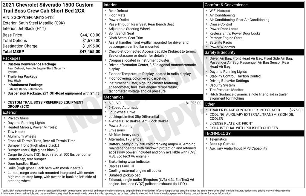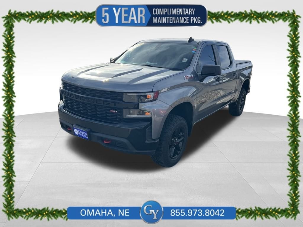 Off the road or on, our bold **2021**Chevrolet**Silverado 1500**Custom Trail Boss**Crew Cab**4X4**Infotainment Package**Remote Starter** in Satin Steel Metallic puts you in charge on every drive! Motivated by a 5.3 Liter EcoTec3 V8 offering 355hp tethered to a 6 Speed Automatic transmission with tow/haul mode for confident capability. For rugged terrain, this Four Wheel Drive truck is upgraded with a two-speed transfer case, a locking rear differential, and a Z71 off-road suspension, plus it scores nearly 21mpg on the highway. Our Trail Boss looks tough with black alloy wheels, red recovery hooks adding flair to a powerful grille, heated power mirrors, and the convenience of a CornerStep rear bumper, plus the EZ Lift/Lower tailgate.Our Custom Trail Boss has a comfortable and upscale cabin that includes supportive cloth seats, single-zone climate control, remote start, and the high-tech advantages of a 7-inch touchscreen, WiFi compatibility, Apple CarPlay®, Android Auto®, and a six-speaker sound system. Thanks to connectivity like that, you can adventure with confidence!Chevrolet offers hitch guidance, a rearview camera, tire-pressure monitoring, StabiliTrak stability/traction control, ABS, and dual-stage airbags. With all that and more, our Silverado 1500 Custom Trail Boss goes for the gold daily! Save this Page and Call for Availability. We Know You Will Enjoy Your Gregg Young Chevrolet Omaha Test Drive Towards Ownership! We offer PRE-APPROVAL programs so call (402) 572-8080 to get started today! At Gregg Young Chevrolet... We'll Go The Extra Mile For You. We have an app for that! Download the Gregg Young Chevrolet application directly to your iPhone or Android.