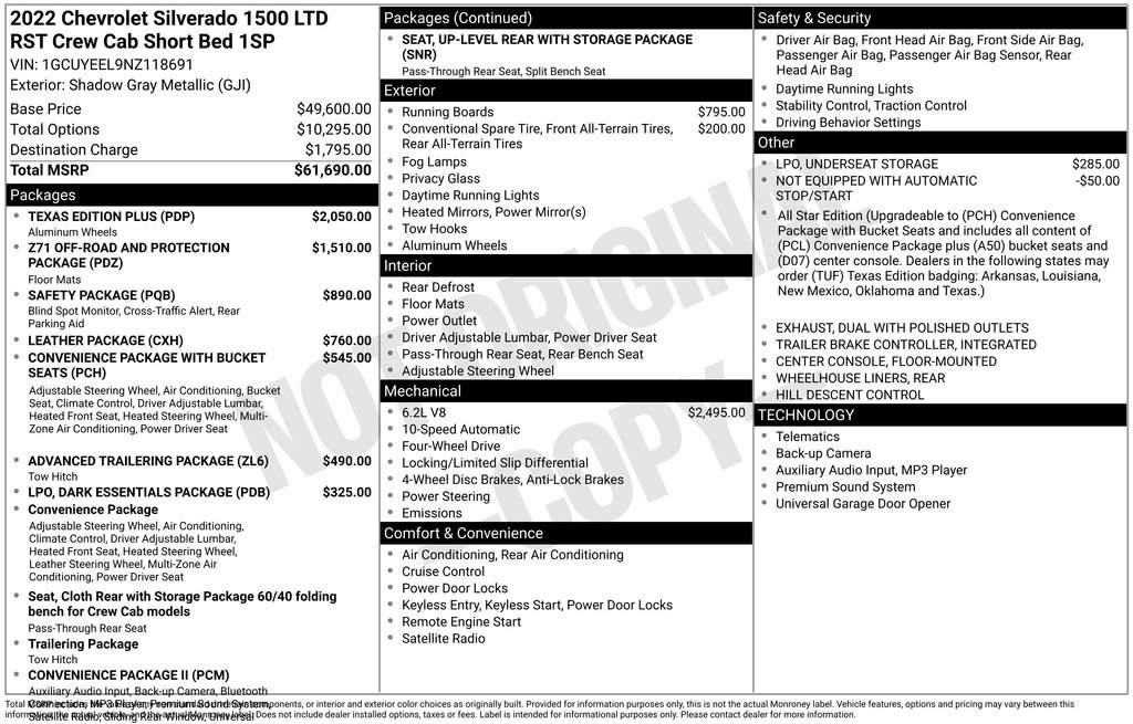 Our **Accident Free**2022**Chevrolet**Silverado 1500 LTD**RST**Crew Cab**4X4**All-Star Edition**Assist Steps** is strong, stylish, and ready to stand out from the crowd in Shadow Gray Metallic! Powered by a 6.2 Liter V8 generating 420hp matched to a 10 Speed Automatic transmission for superior performance. This Four Wheel Drive truck also delivers fantastic towing and hauling capability, plus it returns nearly 20mpg on the highway. Our Silverado is at your service with a bold design, too, including gloss-black recovery hooks, mirror caps, and front Bowtie emblem to go with LED lighting, fog lamps, assist steps, alloy wheels, an EZ Lift tailgate, and a CornerStep rear bumper.