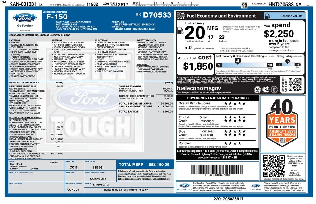 Our muscular **2017**Ford**F-150**Lariat**SuperCrew**4X4**Navigation**Sunroof** makes a strong foundation for better trucking in Ruby Red! Powered by a Twin-TurboCharged 3.5 Liter EcoBoost V6 generating 375hp paired with a 10 Speed Automatic transmission so you can feel confident behind the wheel. Towing and hauling are impressively easy, and this Four Wheel Drive truck scores nearly 23mpg on the highway. A handsome machine, our F-150 features a chrome grille, matching bumpers, fog lamps, LED box lighting, alloy wheels, a SecuriCode keypad, and heated power-folding mirrors with built-in turn signals.