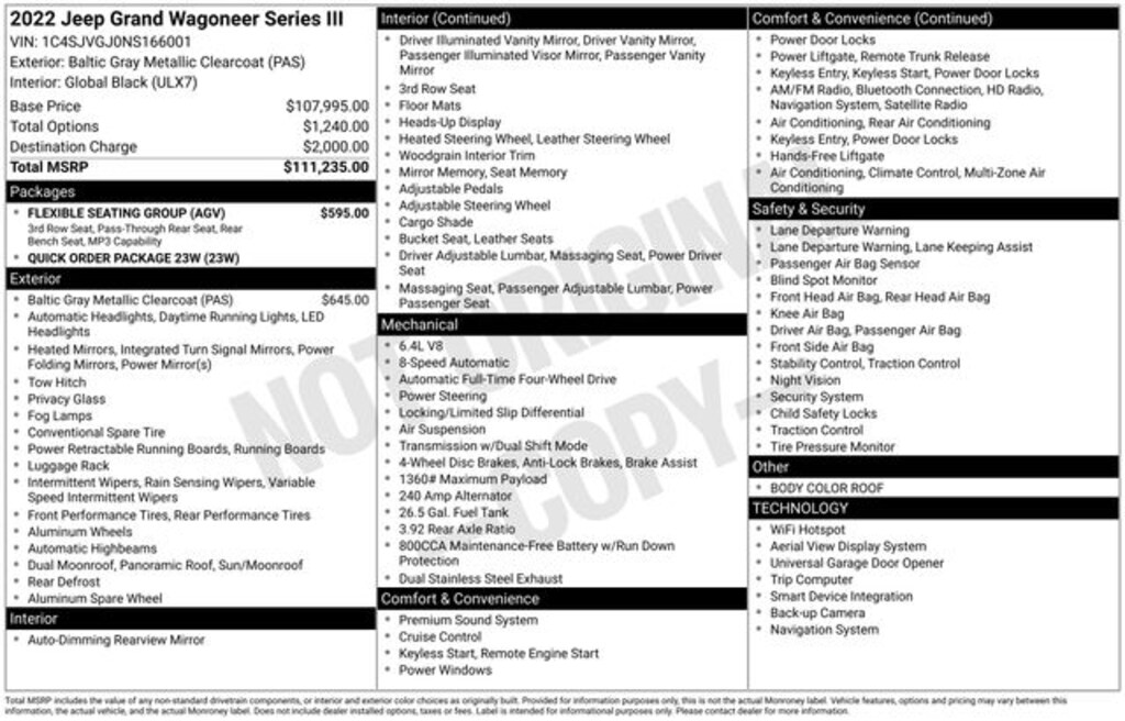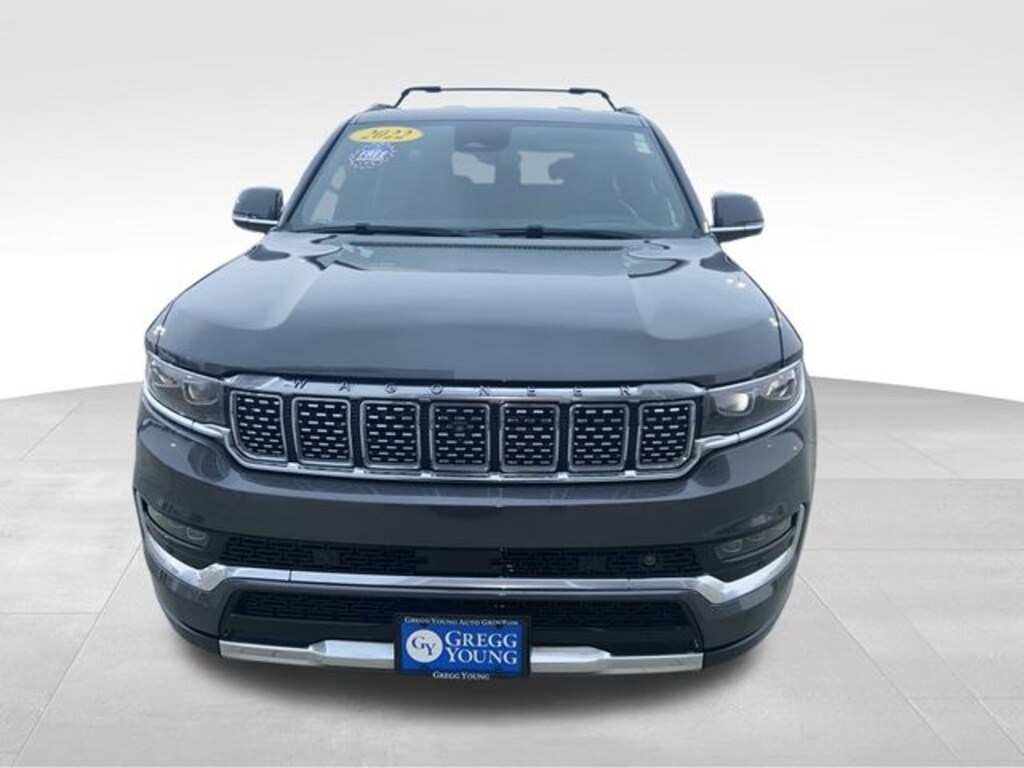 Our **2022**Jeep**Grand Wagoneer**Series III**4X4**Navigation**Sunroof** masters every mile and takes on any terrain with a deluxe Baltic-Gray Metallic design! Motivated by a 6.4 Liter HEMI V8 delivering 471hp to an 8 Speed Automatic transmission for nearly unstoppable capability. This Four Wheel Drive SUV also features plenty of Jeep hardware to handle the rough stuff, and it scores nearly 18mpg on smooth highways. Our Grand Wagoneer gets you noticed, too, with LED lighting, fog lamps, a tri-pane sunroof, power running boards, a hands-free tailgate, and exclusive 22-inch alloy wheels.