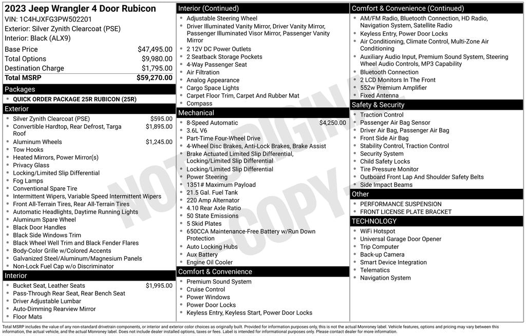Amazingly capable, our Accident Free 2023 Jeep Wrangler Unlimited Rubicon 4 Door 4X4 in Silver Zynith can help you find freedom on the road or off! Motivated by a 3.6 Liter Pentastar V6 serving up 285hp to an 8 Speed Automatic transmission for outstanding strength. This Four Wheel Drive SUV is also well-equipped for wild terrain with features like front/rear Tru-Lok differentials and Rock-Trac 4WD, and it scores nearly 24mpg on the highway. Our Wrangler delivers rugged design cues, too, including steel rock rails, robust skid plates, fog lamps, alloy wheels, bold fender flares, a sport bar, heated power mirrors, a vented hood, and a fully removable soft top.