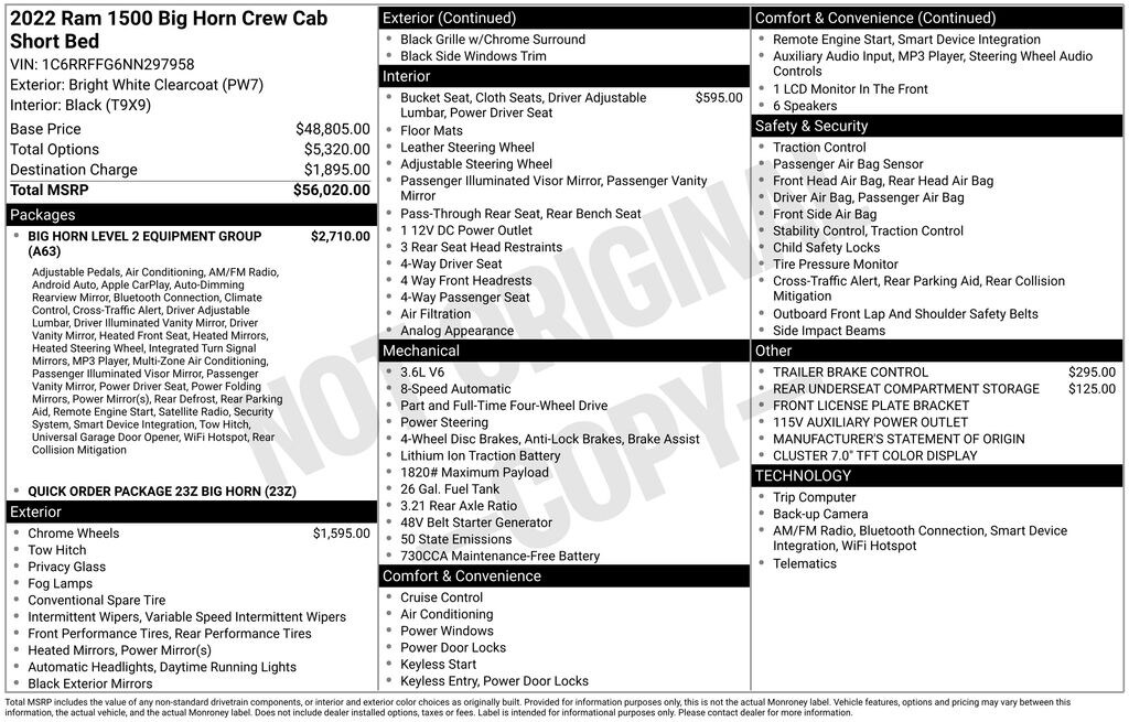 RAM safeguards your travels with a backup camera, electronic stability/traction control, hill-start assist, tire-pressure monitoring, trailer-sway damping, and our package's parking sensors. You're ready to rock when you're driving our RAM 1500 Big Horn/Lone Star! Save this Page and Call for Availability. We Know You Will Enjoy Your Test Drive Towards Ownership!