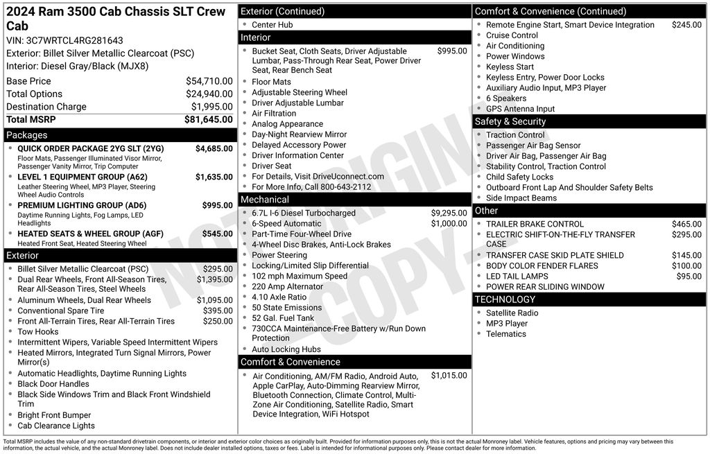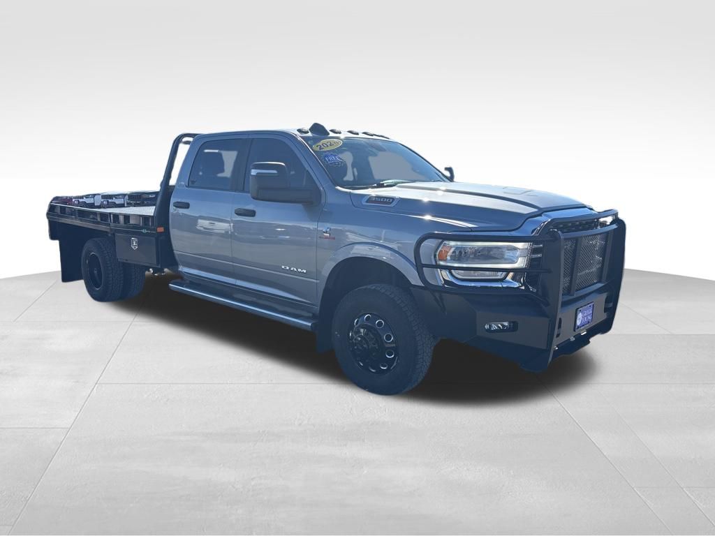 Diesel-powered and dual-wheel strong, our Accident Free 2024 RAM 3500 SLT Crew Cab Chassis Cab 4X4 in Billet Silver Metallic is built to pull big loads with confidence. Powered by a TurboCharged 6.7 Liter Cummins Diesel 6 Cylinder providing 360hp and 1,000lb-ft of torque to an Aisin 6 Speed Automatic transmission that's always ready to get down to business. You'll also be up for almost anything with our truck's composed handling and heavy-duty GCWR, while this Four Wheel Drive RAM flaunts a bold appearance with a gloss-black, billet-style grille, quad halogen headlamps, heated power mirrors, and chrome-clad wheels.