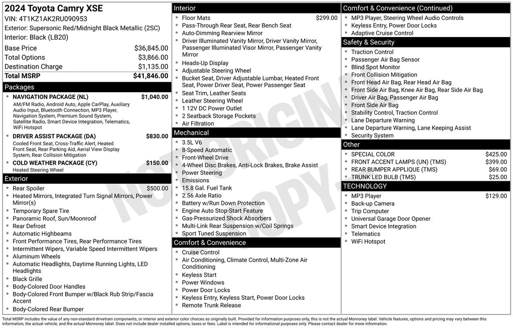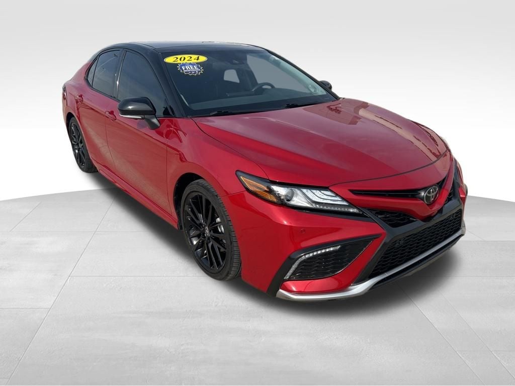 Roll up in our One Owner, Accident Free 2024 Toyota Camry XSE V6 Sedan that shows off an athletically inclined style in Supersonic Red! Powered by a 3.5 Liter V6 serving up 301hp to a paddle-shifted 8 Speed Automatic transmission for remarkable road authority. You can also tame tight corners with the sport-tuned suspension, and this Front Wheel Drive sedan scores nearly 32mpg on the highway. Anything but dull, our Camry's exterior excites the senses with a panoramic sunroof, LED lighting, color-keyed rocker panels, a rear spoiler, 19-inch gloss-black wheels, and dual exhaust with quad chrome tips.